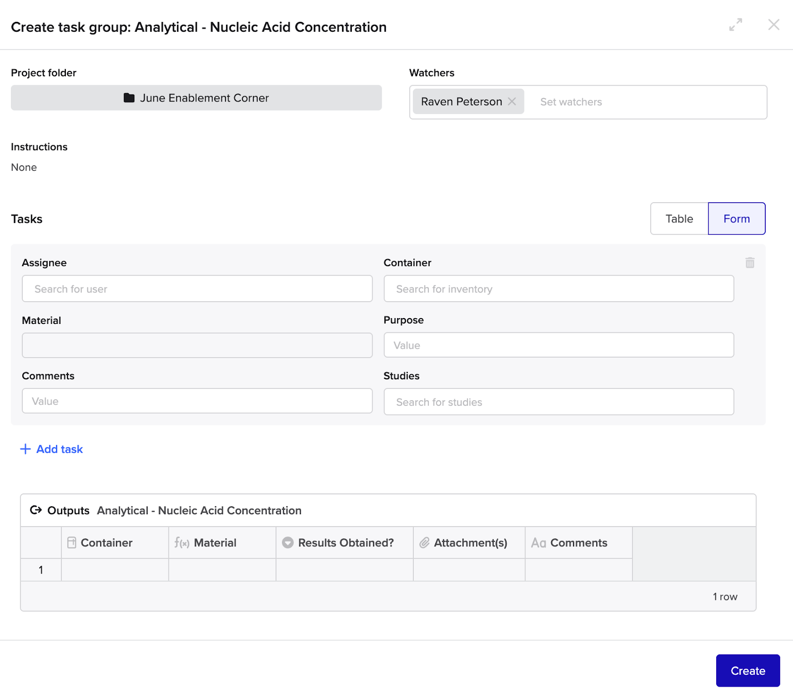 - In the Create Task group modal, click the Form option above the Task table