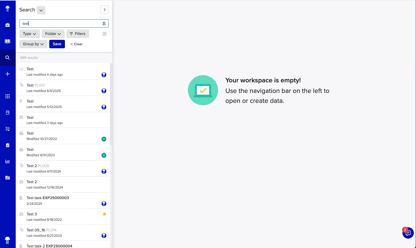 Save and share search queries for consistent data retrieval across your team. Sharing these saved queries ensures your collaborators can access consistent, validated views of important data, especially useful in regulated environments or team-wide workflows where data traceability and repeatability matter. To share a saved search: