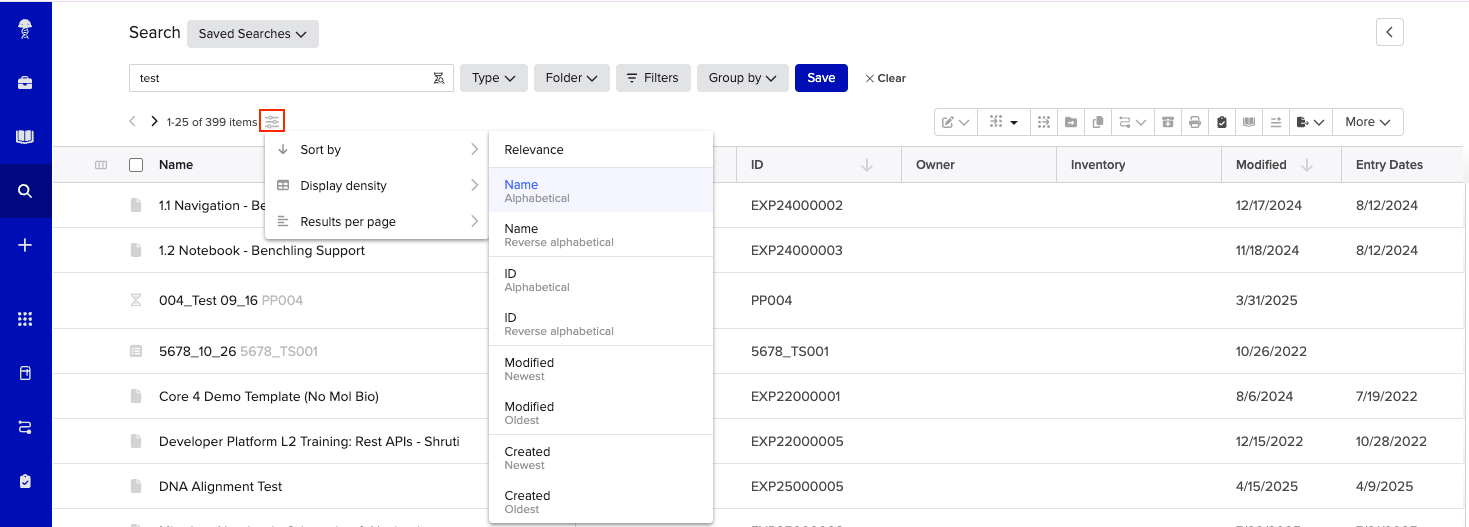 Customize the results of your search with filters to focus on relevant data and surface the most useful results using the sort by menu. This allows you to define the number of results on the page, how they appear, and how they are sorted. To make adjustments to your search results:
