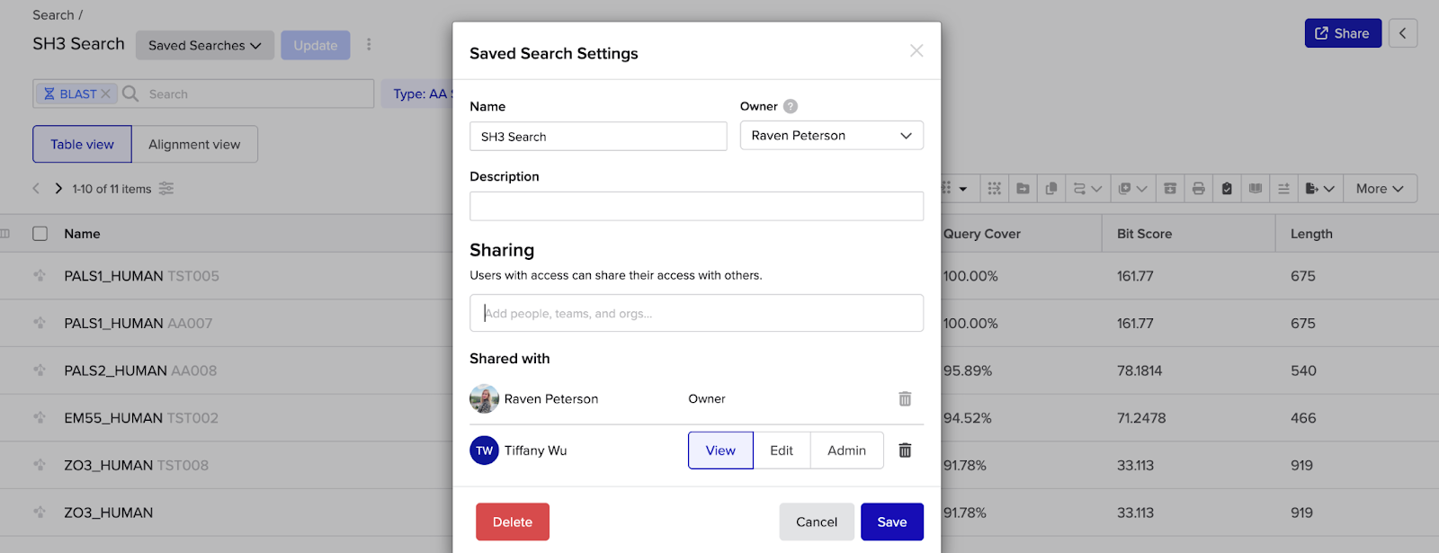 - Use the search bar to find the people, teams, and organizations that should have access to the saved search