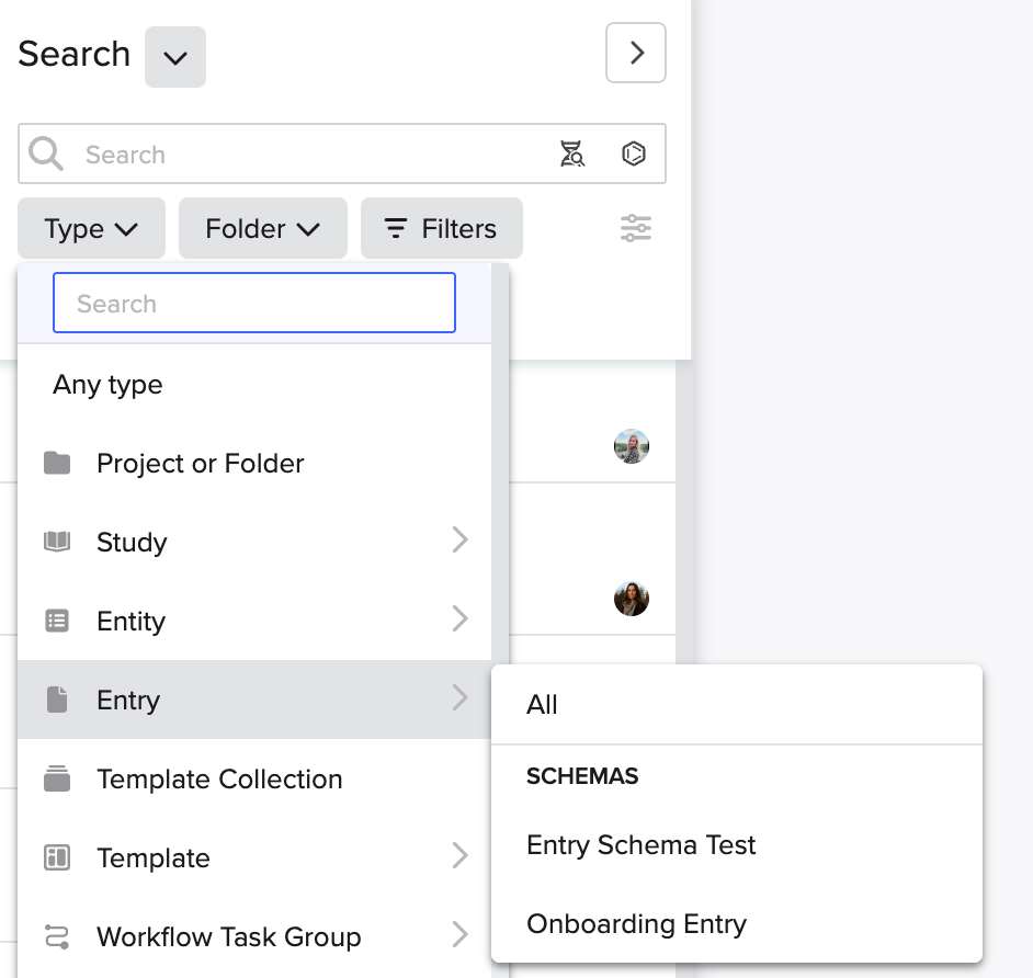 Another way that you can filter your searches is by using the Type dropdown. This allows you to set your search parameters for a specific type of object (ex. Registry entity or Inventory object) or for a specific schema.