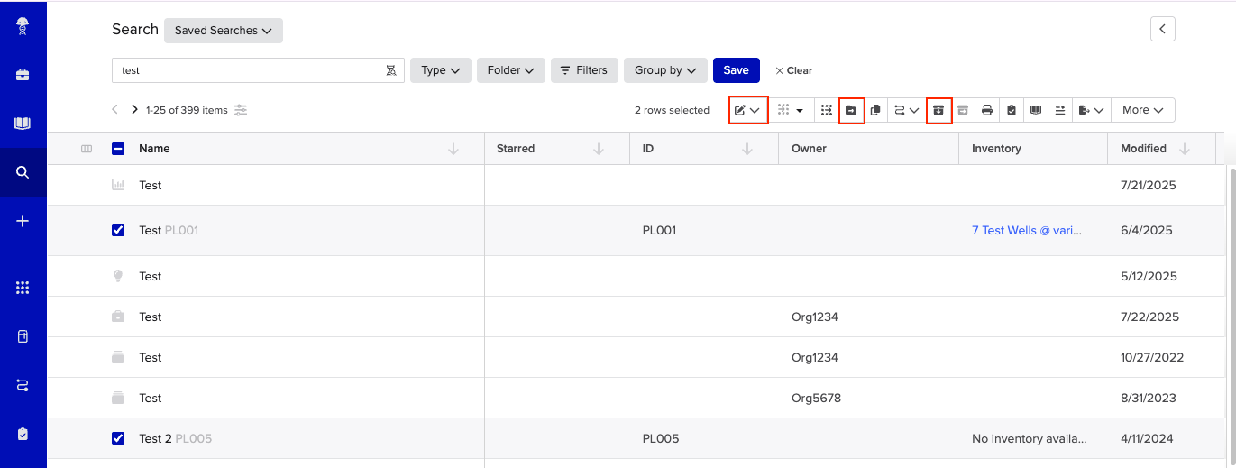 Each application may also allow bulk actions from the search result view. For example, after running a Registry or Inventory search, you can select multiple results and apply actions such as Export, Archive, or Edit depending on your permissions. To take actions on search results: