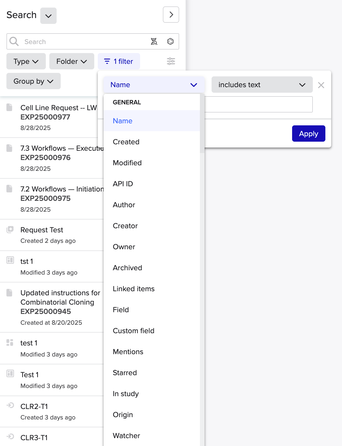 In the example below, we show how to filter Notebook entries based on specific schema fields. This is especially valuable when working with standardized entry templates allowing you to search across entries by parameters like experiment type, strain, or batch ID. It makes schema-driven documentation more searchable and easier to analyze at scale. To search by entry schema fields: