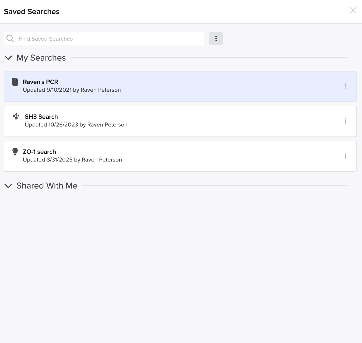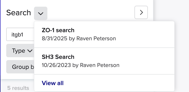Alternatively, click view all to open a menu that displays a list of all the searches that you’ve saved or have been shared with you.