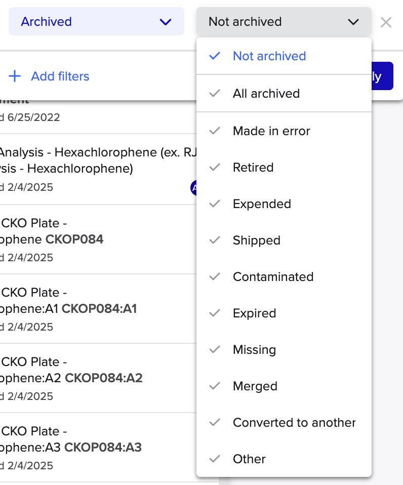- From the left hand dropdown, select Archived and use the right hand dropdown to specify either All archived or specific archive reasons