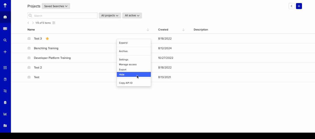 Organize your project list by starring frequently used projects and hiding less relevant ones. This allows each user to personalize their workspace without impacting collaborators. Starring keeps your most important projects easily accessible at the top of the sidebar, while hiding helps reduce visual clutter for infrequent or archived work. frequently used projects and hiding less relevant ones.