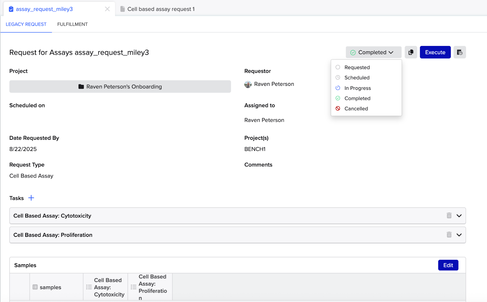 Each sample will generate an individual Notebook entry or legacy Workflow stage run. Fulfillers can execute from the fulfillment tab or from the legacy Request view directly.