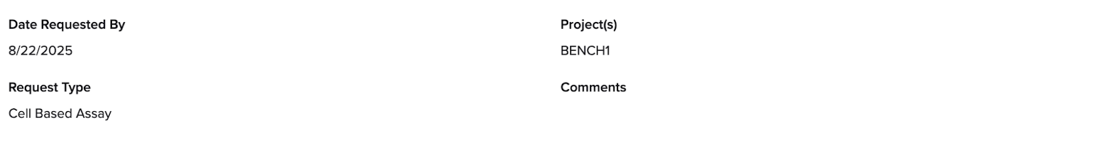 - Assigned to: Requestors can assign a request to another Benchling user or team, who will receive an email. This means you do not need to create an "assigned to" field during Request schema configuration.