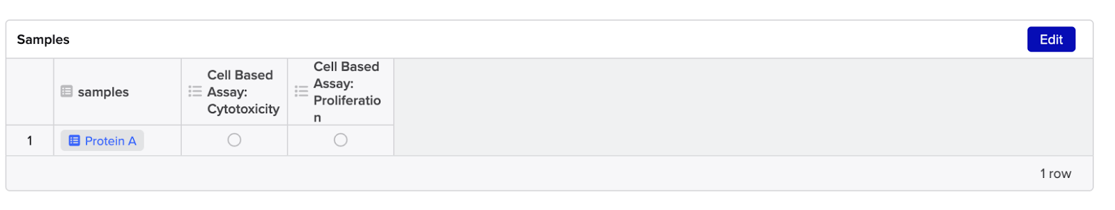 - If you did not add samples when you created the legacy Request, click Edit on the Samples table to add samples either by row, imported from plate or box, or imported from spreadsheet