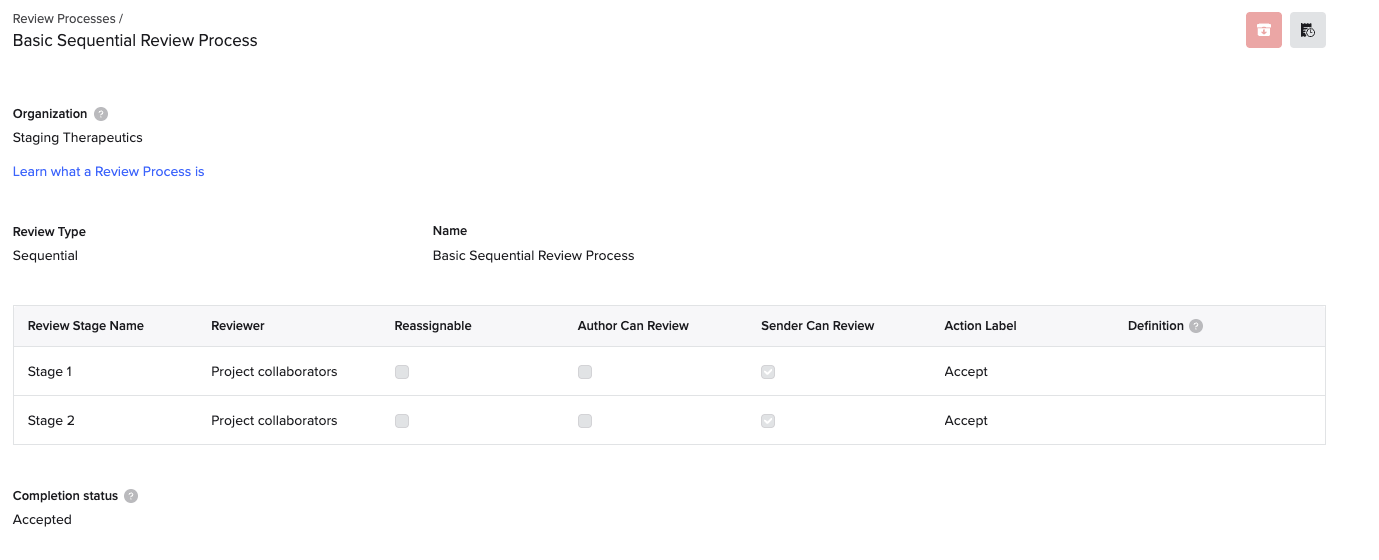 - Sequential review: Reviewers must complete review stages according to specified order in the review process configuration