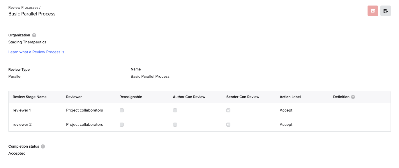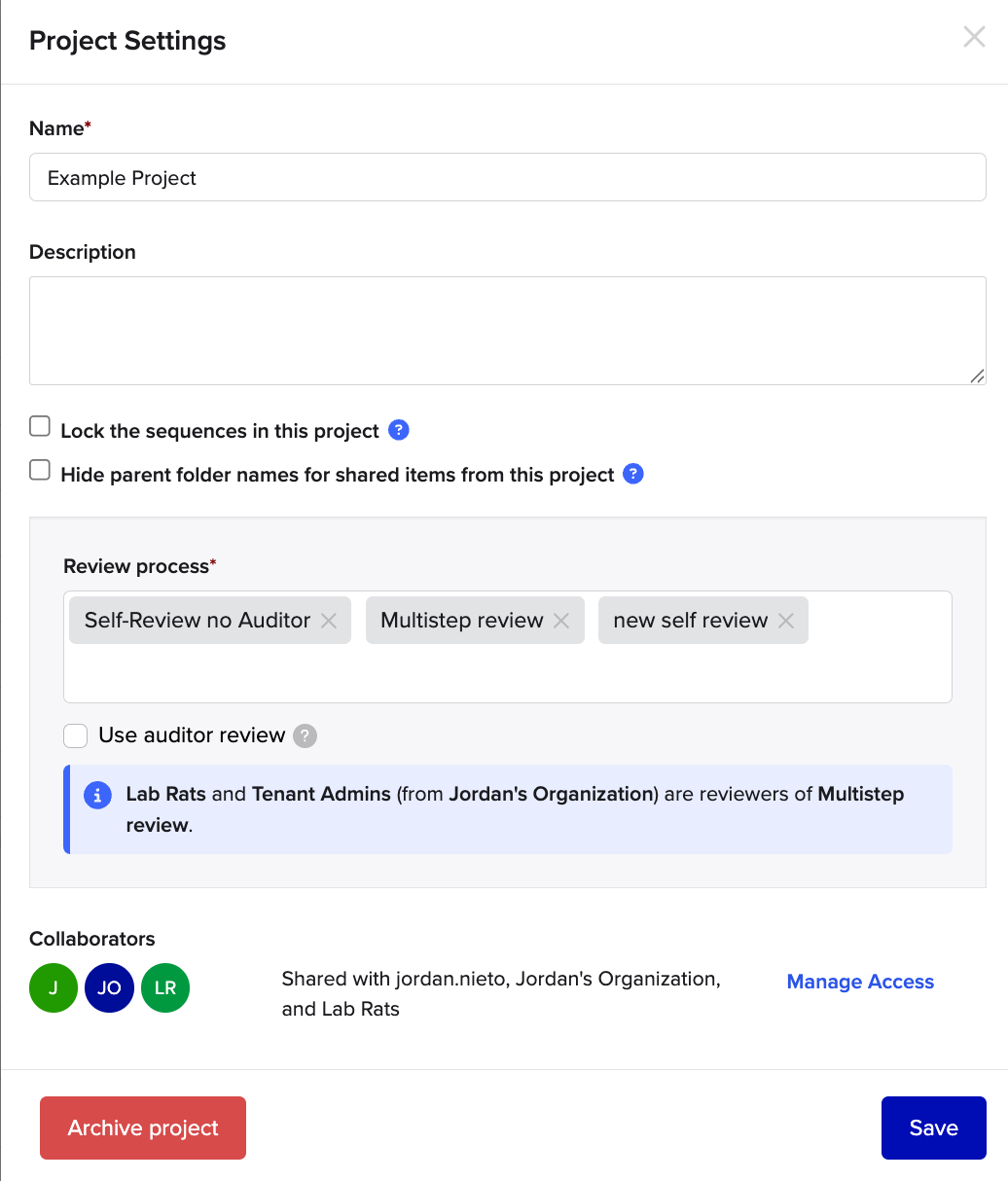 Note: once saved, review processes cannot be deleted, if you need to stop using a review process, you can remove the process from Project Settings.