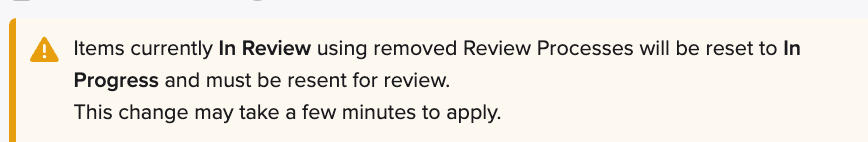 Note: assigning a review process removes the Auditor checkboxes from the Manage Collaborators section. Also, when making changes to the Review process selection you may see a warning notifying you that any In "Needs Review" entries will need to be resent for review.