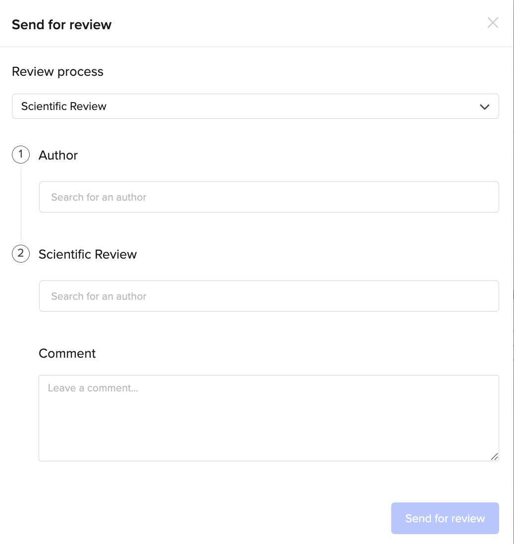 - Reviewer: The pool of users the author can select from when sending an entry for review. Options include authors, teams, or project collaborators