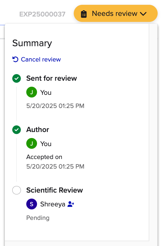 After a review process is assigned to a project, authors can initiate the review flow for their entries (or worksheets, for Bioprocess users). Sending an entry for review formalizes the approval process and signals that the entry is ready for validation by reviewers.