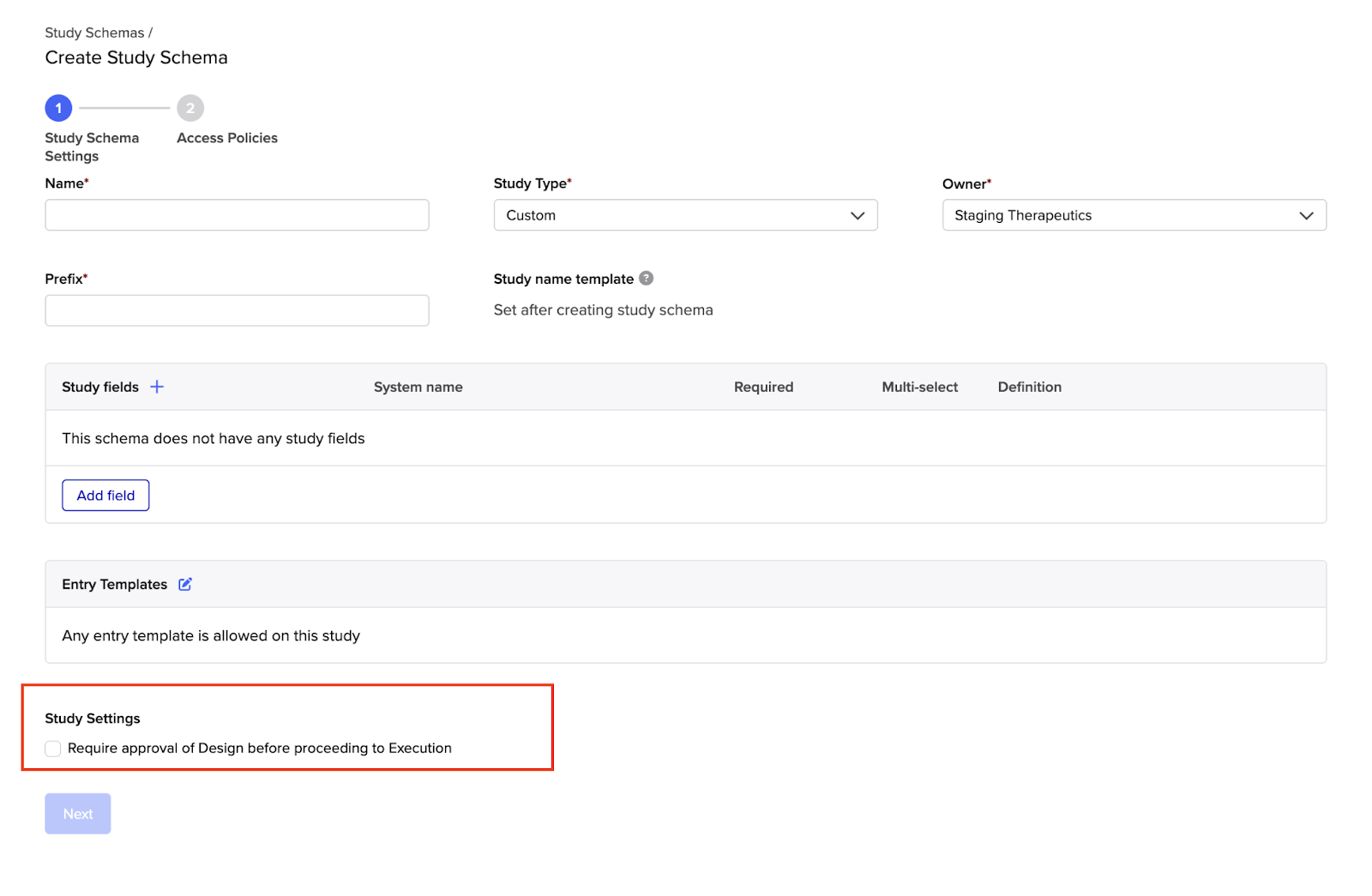 For Custom Studies admins can require that the study design be reviewed and approved before the study can proceed to execution. This setting is configured on the Study Schema.