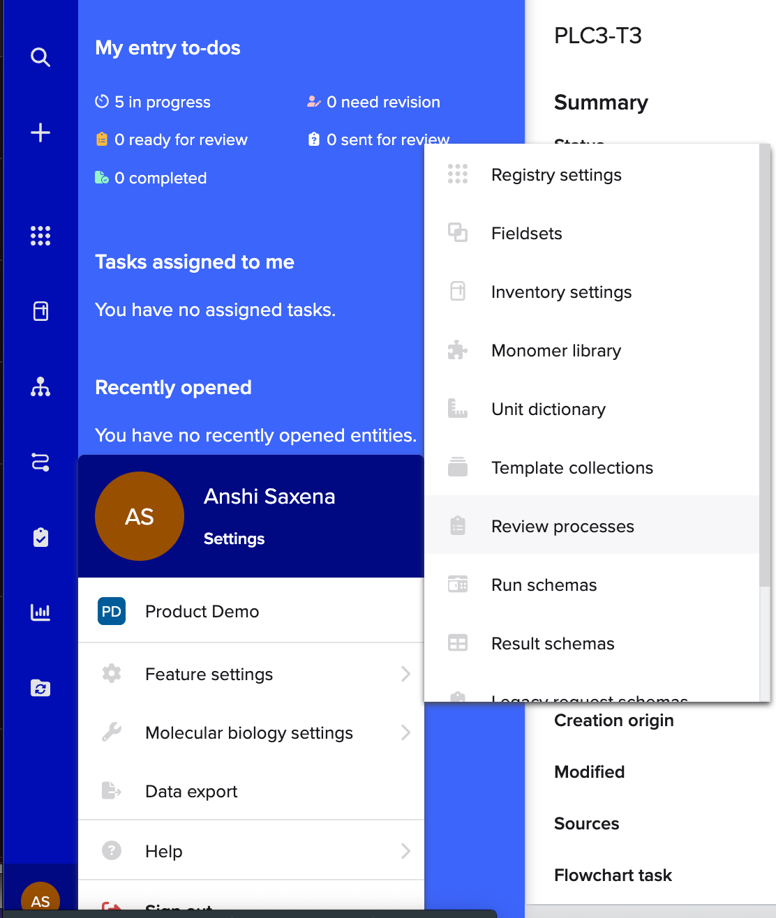 Review processes in Benchling streamline the validation and approval of entries, worksheets, and Studies ensuring data integrity and compliance. By configuring review processes, teams can enforce standardized workflows, assign the right reviewers, and maintain a clear audit trail of approvals. There are several types of entry review: