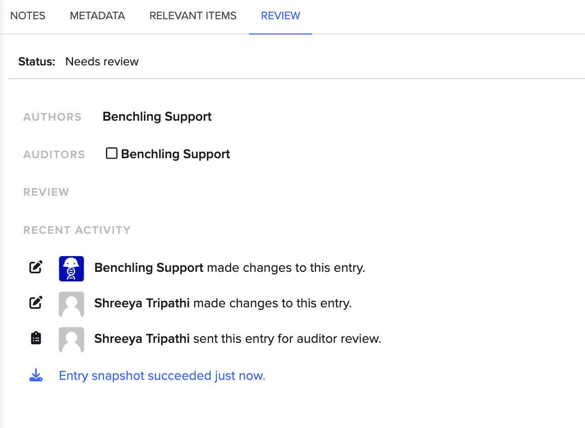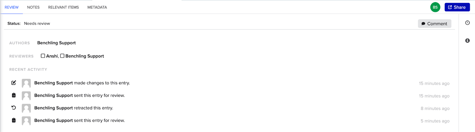 Benchling's legacy review system offers a structured approach to reviewing and witnessing Notebook entries. This system ensures data integrity and compliance by allowing designated auditors to review entries against predefined criteria. By integrating review processes directly into your Notebook workflow, teams can maintain consistent documentation standards.