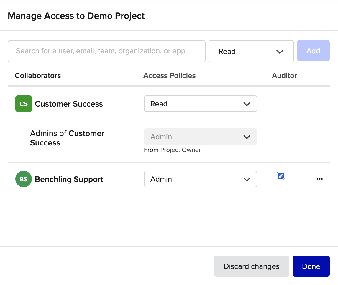 - In the Manage access modal, check the box under Auditor for each collaborator you wish to designate as an auditor