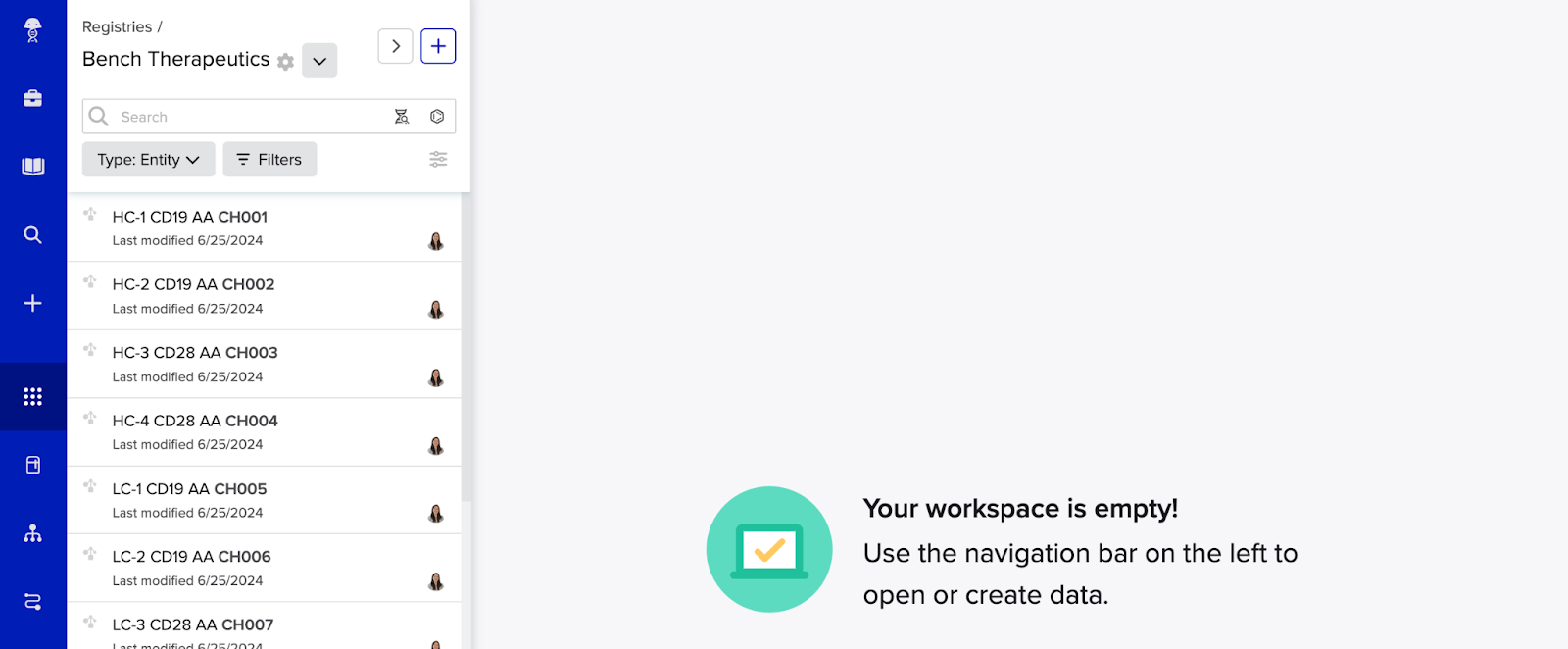 - Use the Search bar at the top to locate entities by name, ID, or metadata.