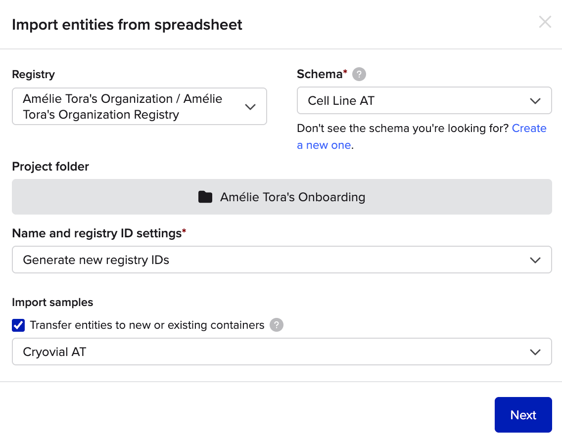 Note: when importing entities in bulk, the order they are created may not follow the order of your spreadsheet. This is due to Benchling’s performance optimizations that may parallelize the creation process. For consistent naming, consider asking your admin to use a naming template with renaming options upon Registration.