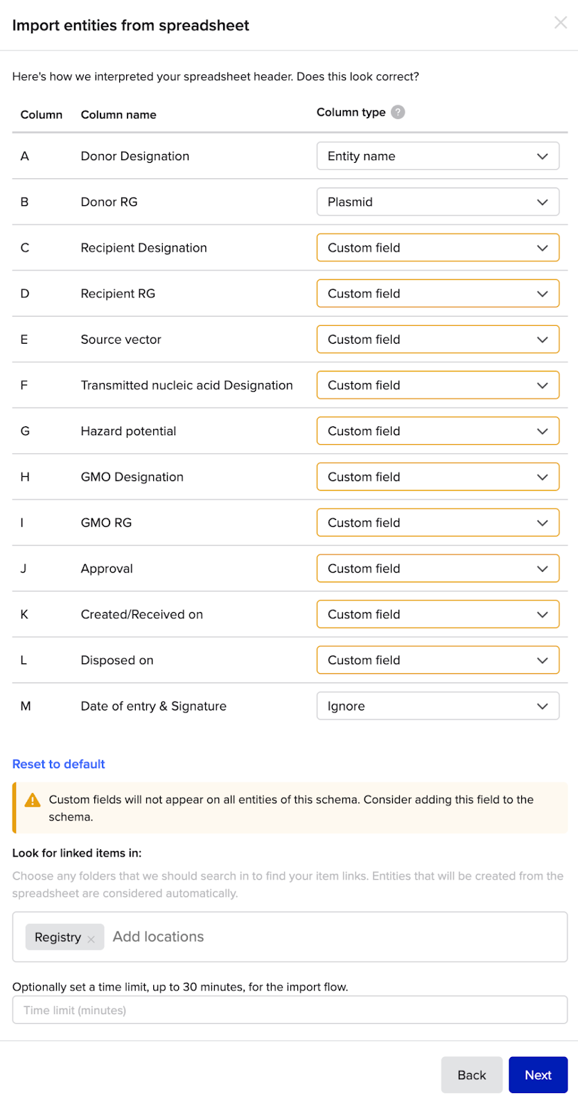 - Map the spreadsheet columns to the appropriate schema fields