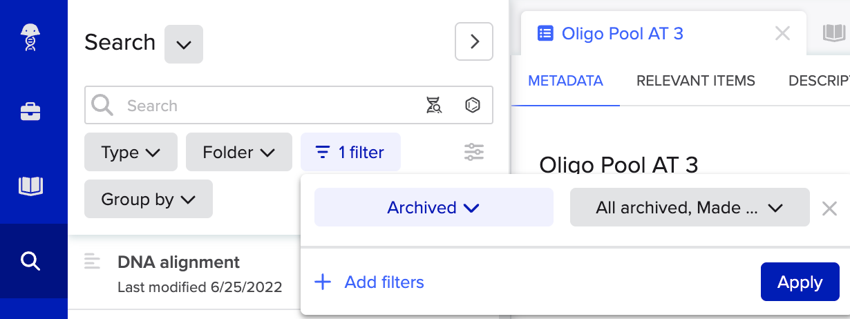 - From the project, registry or global search tool, make sure to set up a filter on the Archived objects