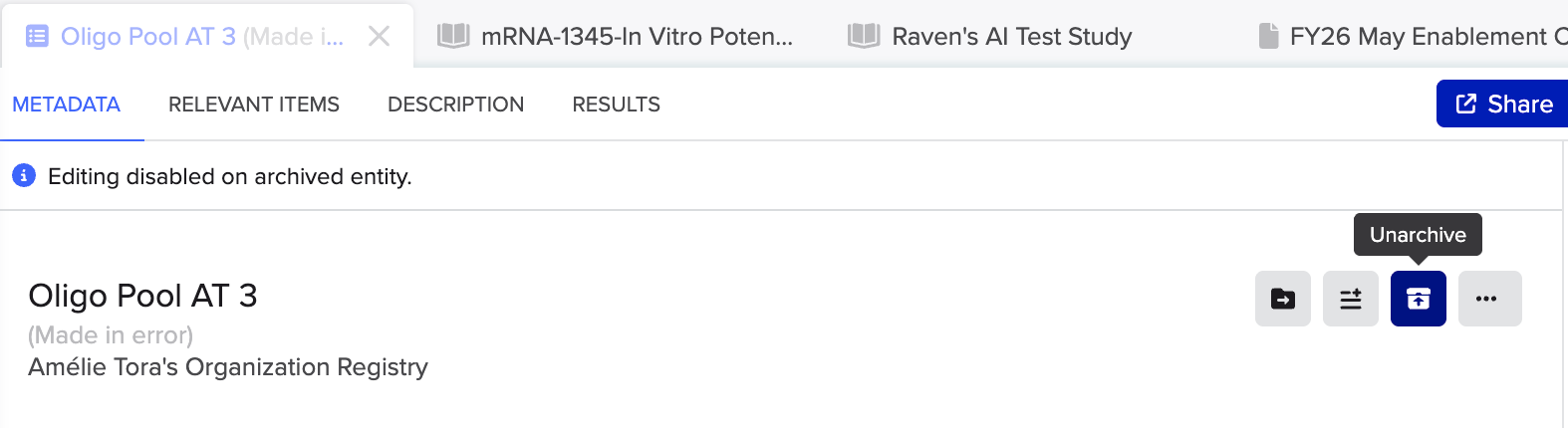 - In the metadata tab click the icon to Unarchive