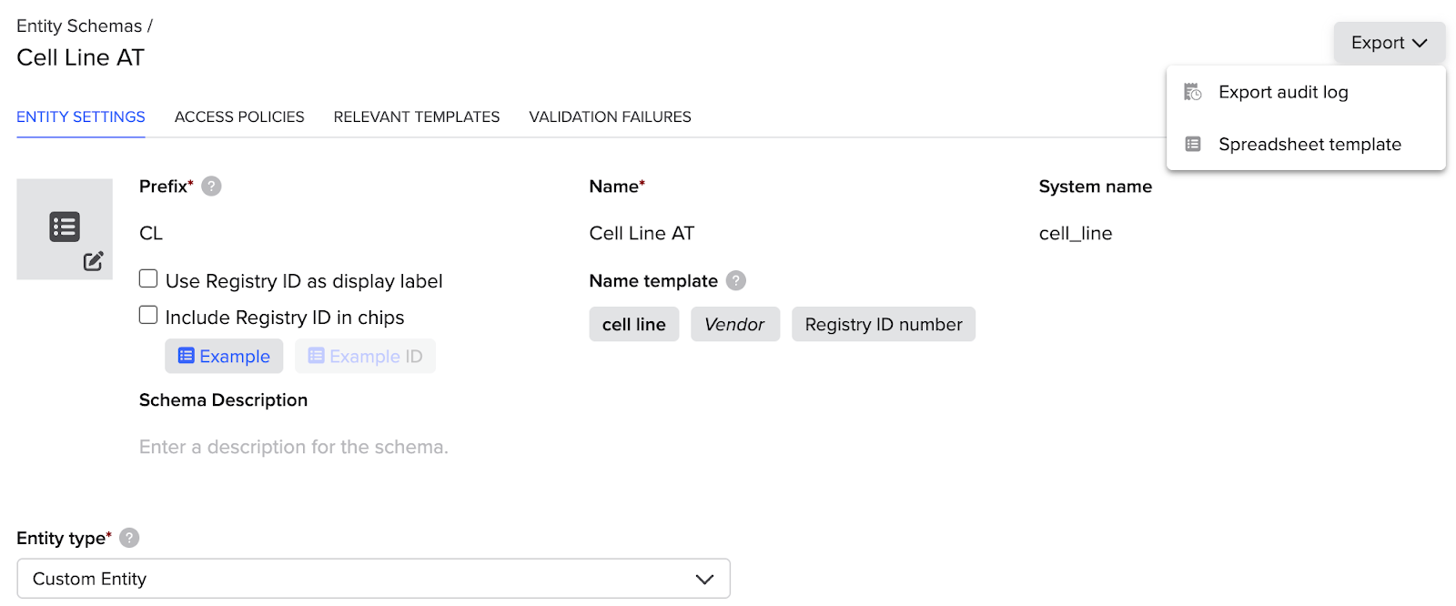 - Select the appropriate schema (e.g., Plasmid, Cell Line)