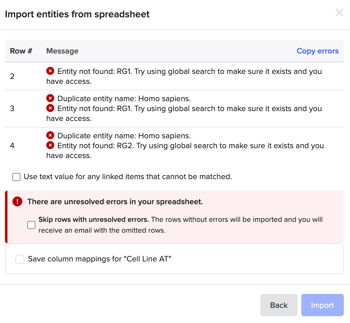 - You may skip the rows with unresolved errors or use a text value for any linked items that cannot be matched