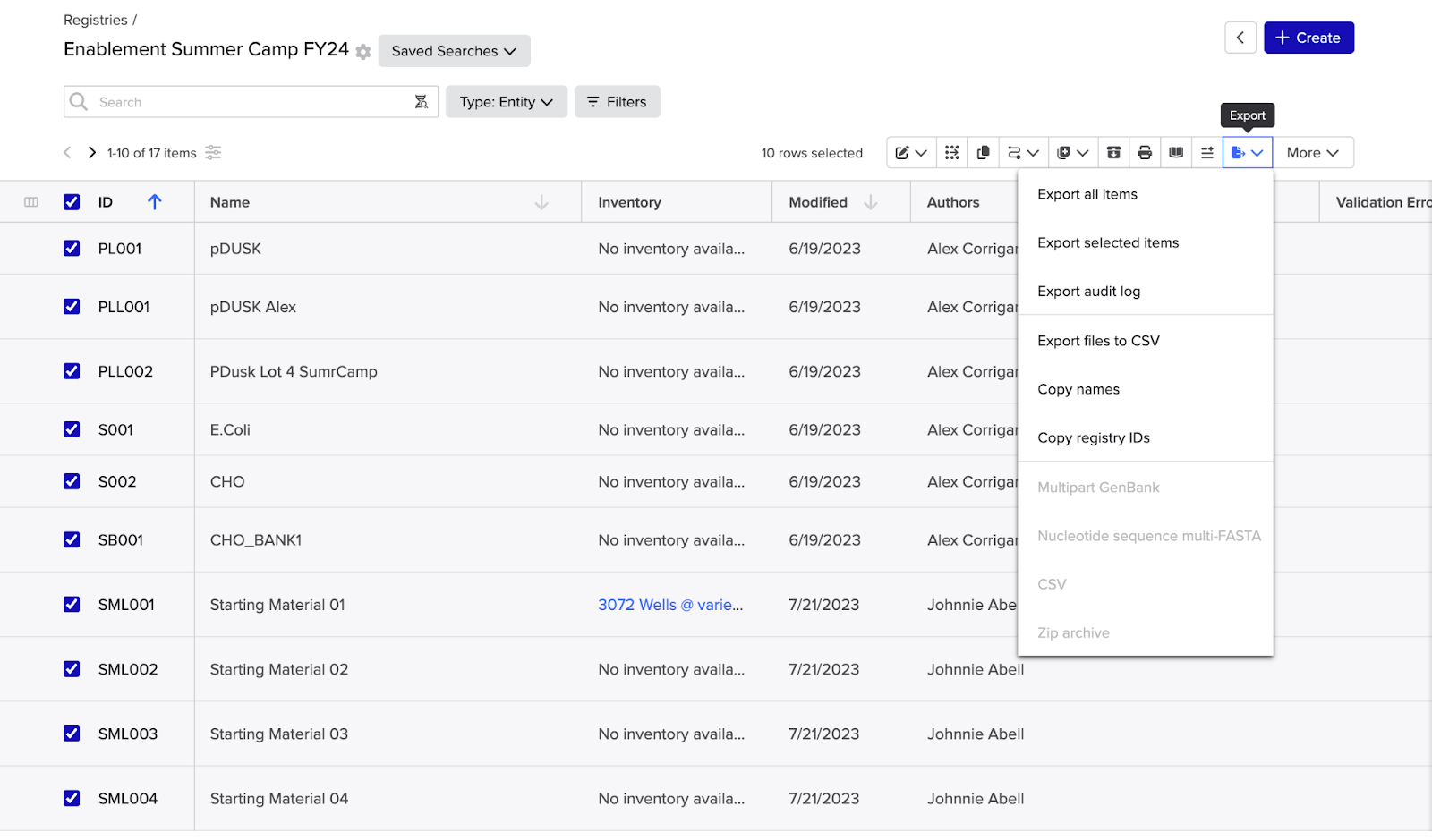 - Using the checkboxes in the expanded view, select the entities you’d like to export