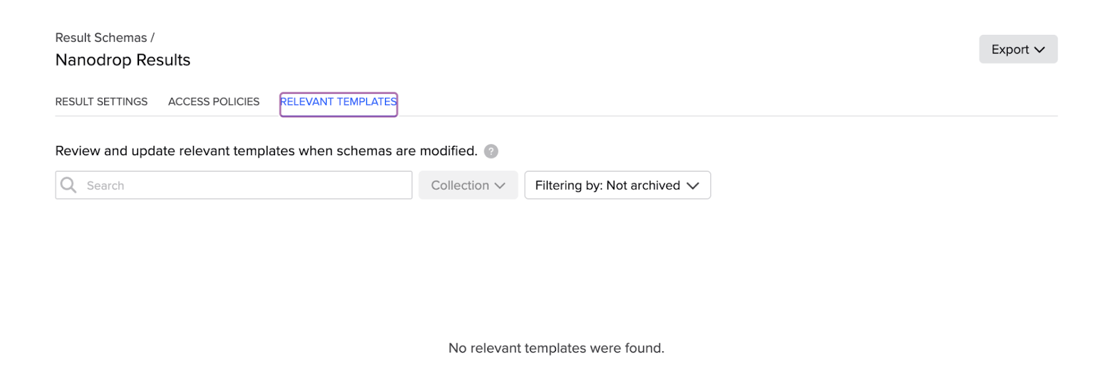 After updating a Result schema, you can use the Relevant templates tab on the Result schema configuration page to find templates that include: