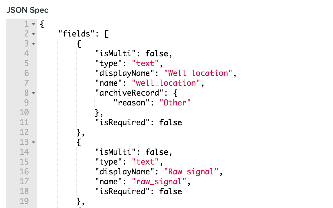 - In the JSON spec editor, scroll to find the field that you wish to archive and add a new property called “archiveRecord” with the reason for archival