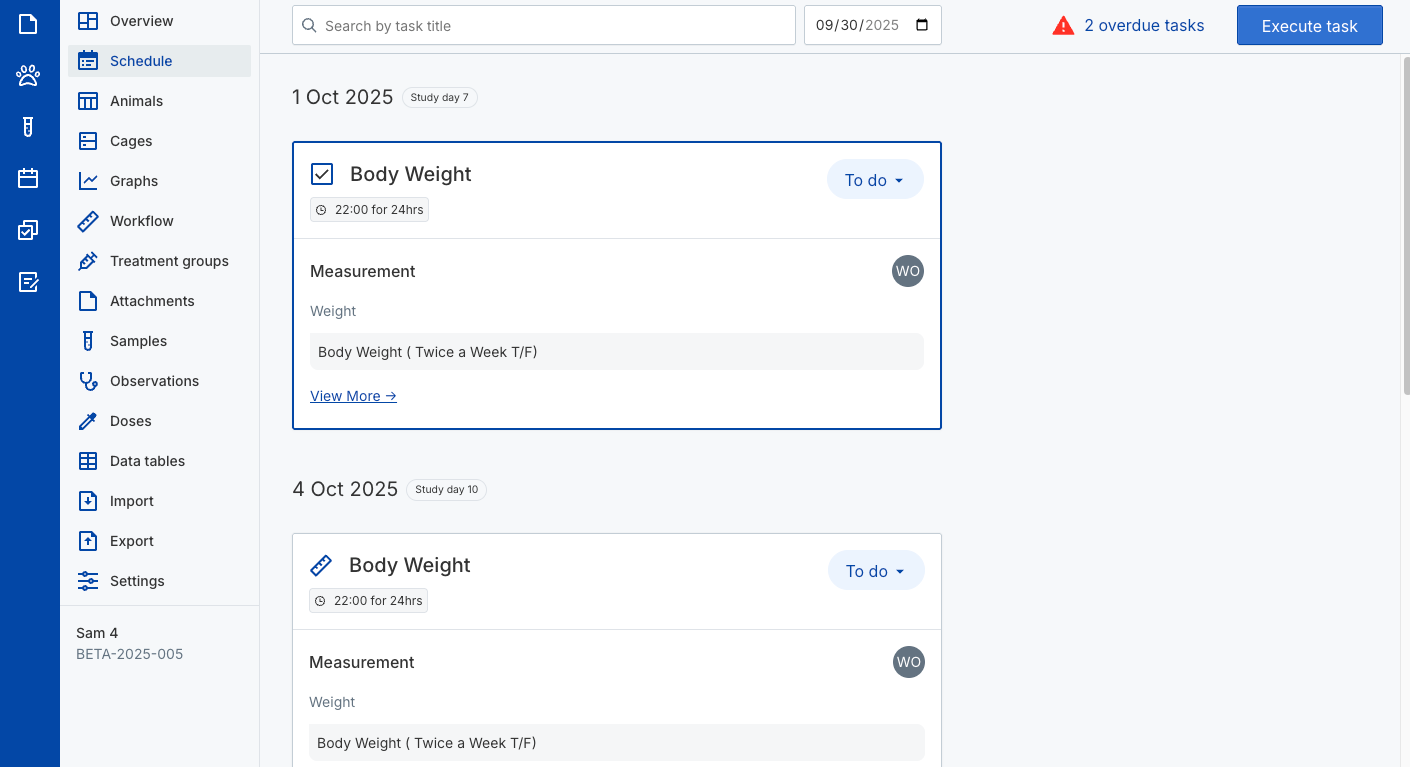 Benchling In Vivo supports multiple methods for capturing and managing study data, including workflows, data tables, animal profiles, bulk imports, doses, and attachments. Tasks can also be configured and executed to streamline data collection, with progress tracked in the calendar or study schedule. Once data is collected, you can visualize results across animals and groups, generate summary tables and analyses, and export study data in multiple formats. Audit logs are available to track study modifications and support quality control.