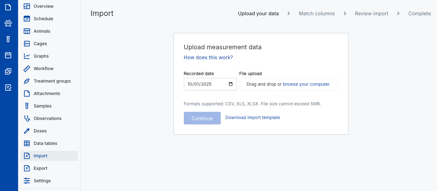 You can import measurement values from .csv, .xls, and .xlsx files. A correctly formatted template can be downloaded from the Import section of each study. Only one calendar day of measurements can be imported at a time — to import multiple days, repeat the process with one file per day.