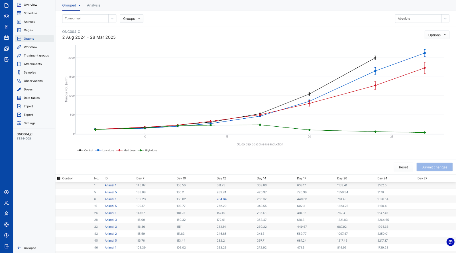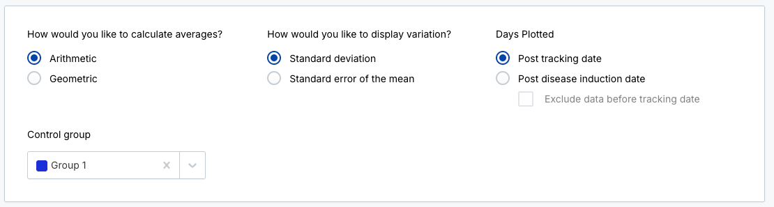 - Toggle the Exclude data before tracking date option to hide measurements taken between each animals induction date and tracking date from graphs