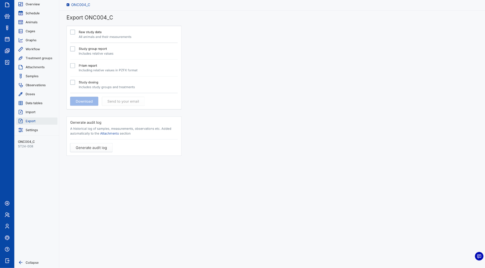 You can export core study data at any time from the Export tab. You can email core study data to yourself or download it directly from the study. You can also export data tables, samples, observations, and summary tables directly from their respective sections in a study.