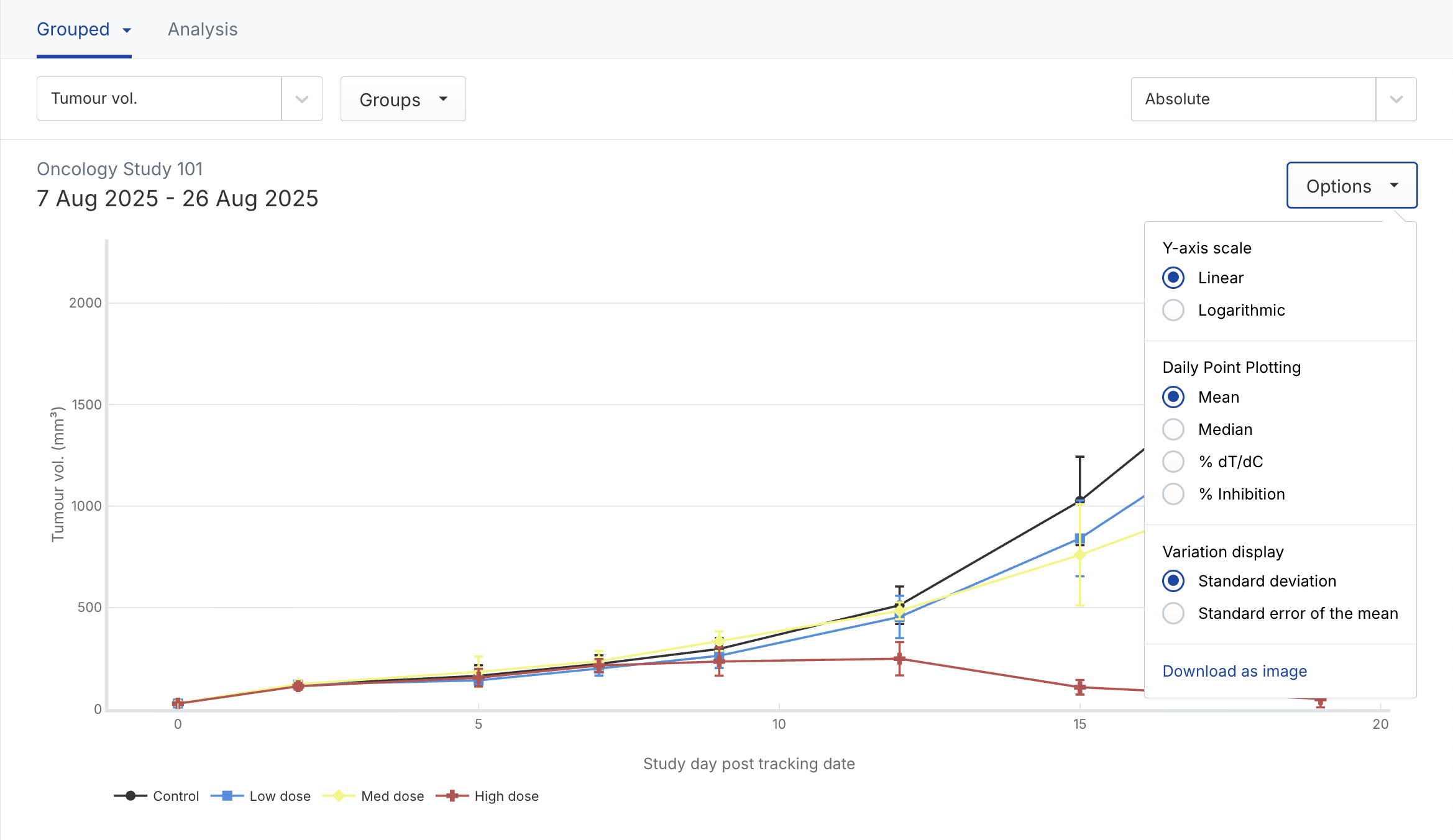 - Tumor volume on day: Tumor volume on analysis day, using mean or median summary statistic