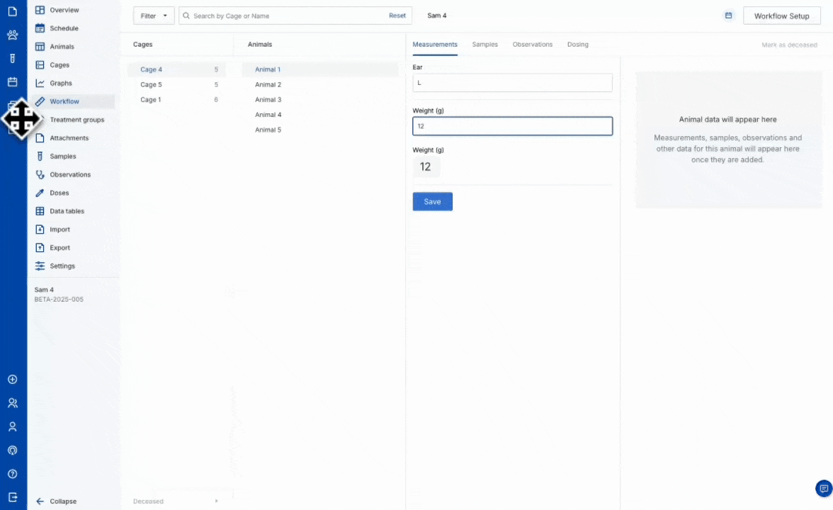 - Select animals by searching for their ID, scanning (if using supported devices), or clicking on the animal in the correct cage