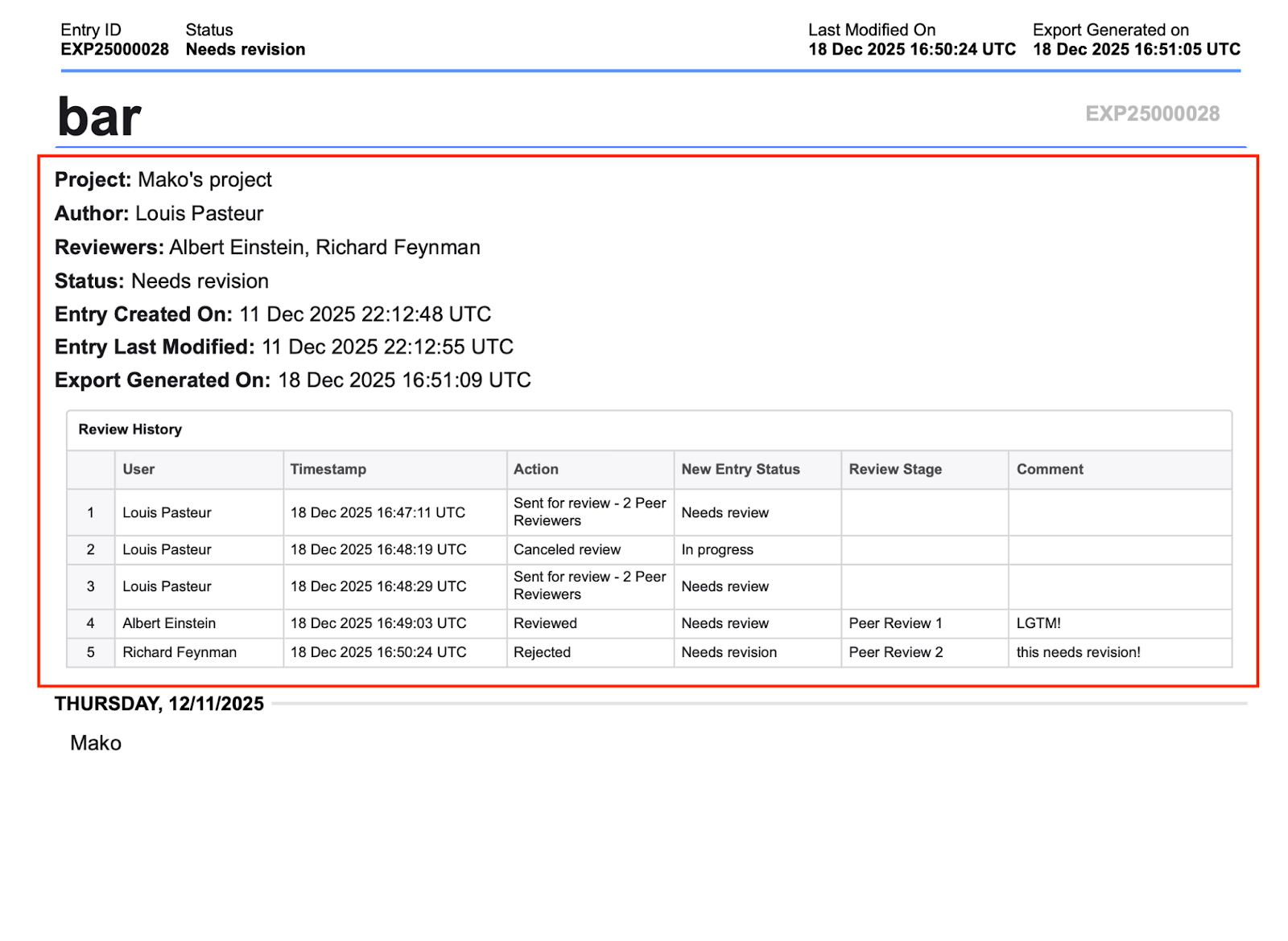 Between December 4, 2025 and December 12, 2025, Notebook Entry exports were generated without certain metadata information. This issue has been resolved; however any Entries exported during this timeframe may need re-exported to ensure complete Entry exports..