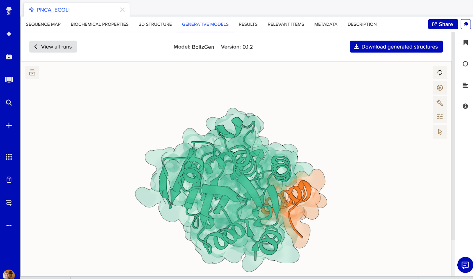 When enabled, this feature allows users to see generative models for binder design. Currently limited to BoltzGen.