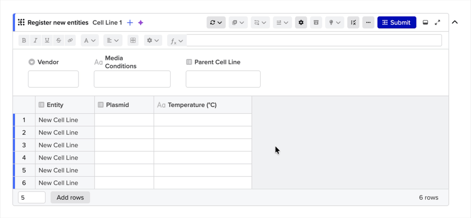 Single input fields in editable structured tables can now be customized to improve table readability and layout, making template design more flexible. Field width can be adjusted by clicking and dragging the right edge of a field, and fields can be reordered by dragging the handle located to the left of the field name. These improvements apply across Notebook entries and worksheets.