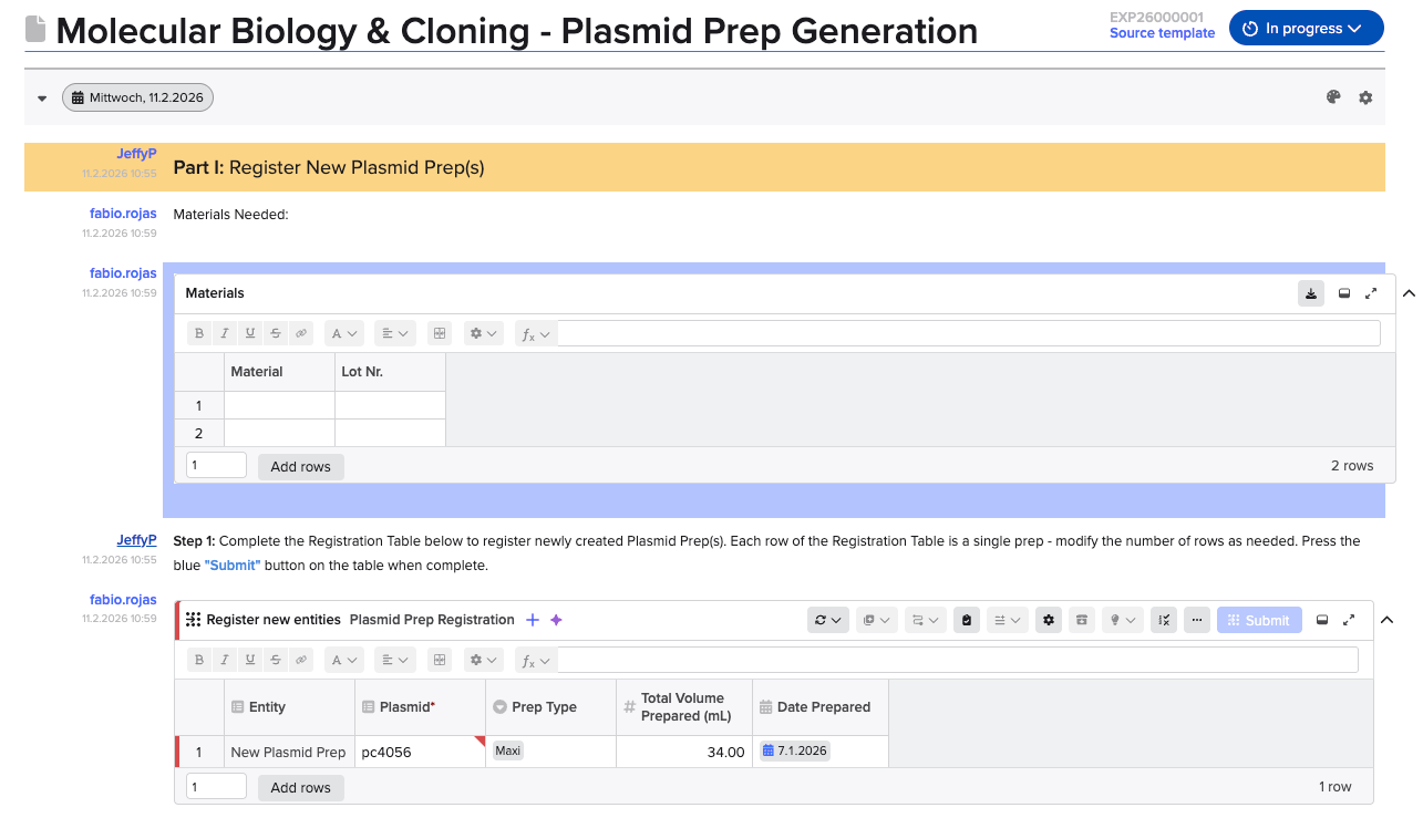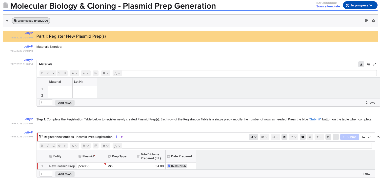 As illustrated in Image 3, if a user modified only the NotePart containing the Plasmid Prep registration table (for example, changing the dropdown value from “Maxi” to “Mini”), the newly created version would display all NoteParts as updated by that same user at the same time, even though only one NotePart was actually modified.