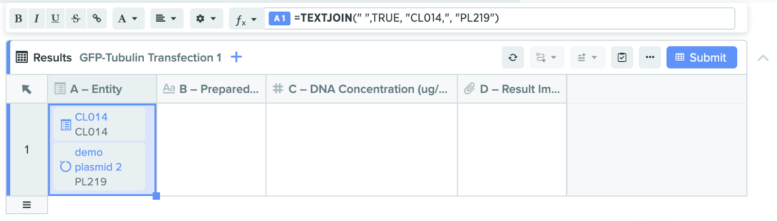 Users can leverage the TEXTJOIN function on tables to combine text from multiple ranges and/or strings. TEXTJOIN allows users to reference a range of single entity-link cells in other structured tables, adding them all to a single multi-link field.