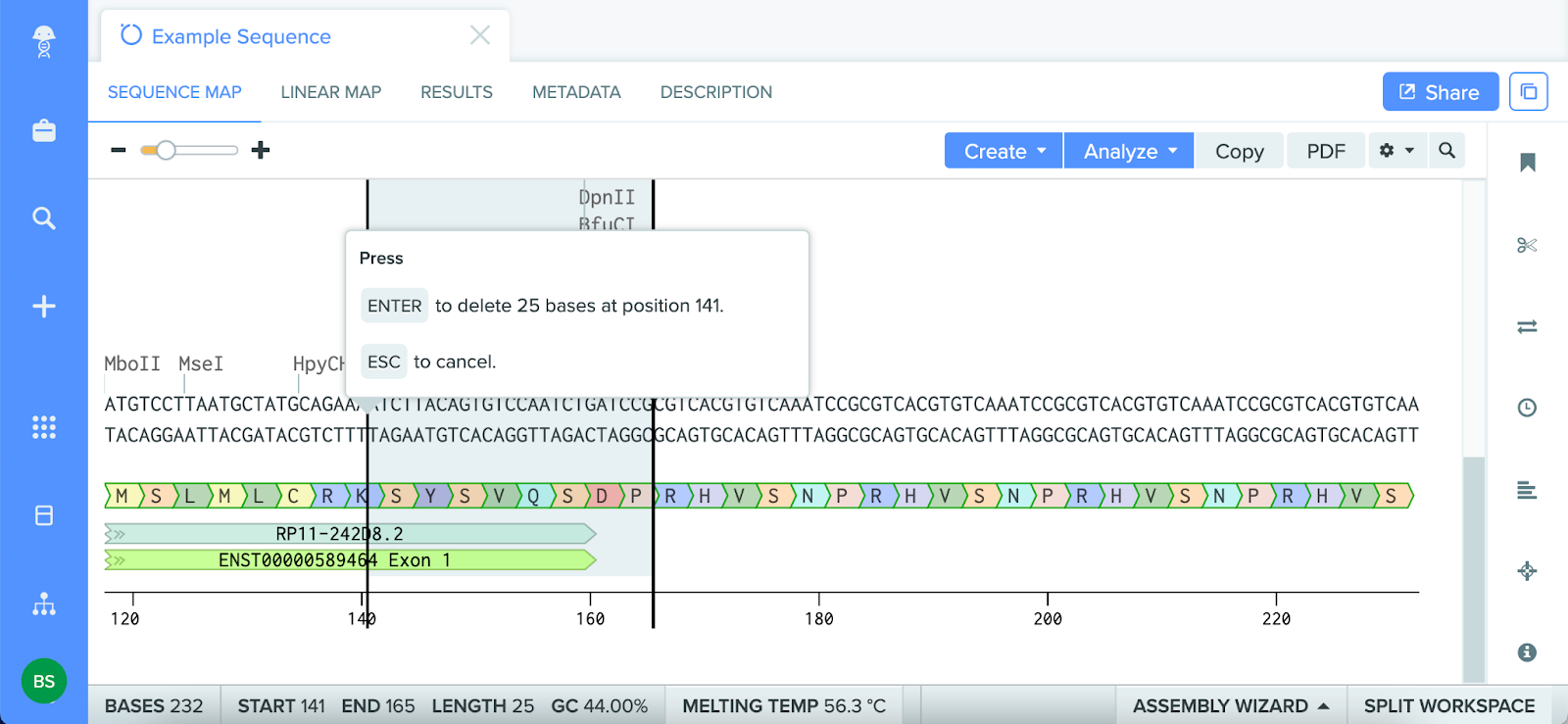 When deleting bases on sequence maps, an explanatory tooltip displays.