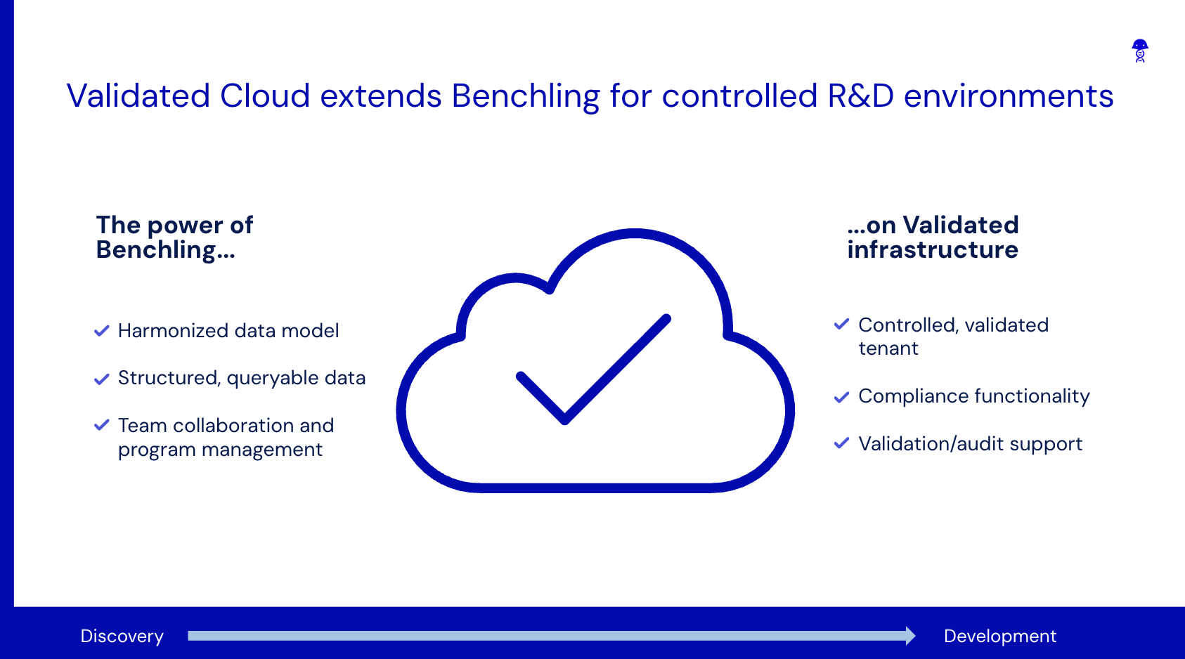 As life science companies advance products through the R&D lifecycle, the focus gradually moves to more controlled, methodical development. This phase requires a more structured approach to data capture, often driving companies to use disparate IT solutions and making it increasingly difficult for Research and Development teams to collaborate across phases. With Benchling Validated Cloud, Research and Development teams operate from a unified validated informatics solution.