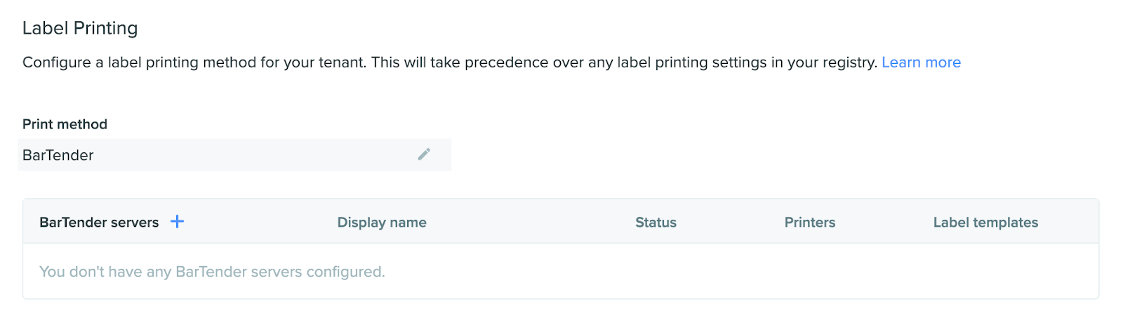 To set your print method to BarTender, follow the steps outlined earlier in the article. To make your BarTender servers available on the network to anyone needing to print labels, you must point Benchling to the servers by adding their URLs on the Label Printing settings page.