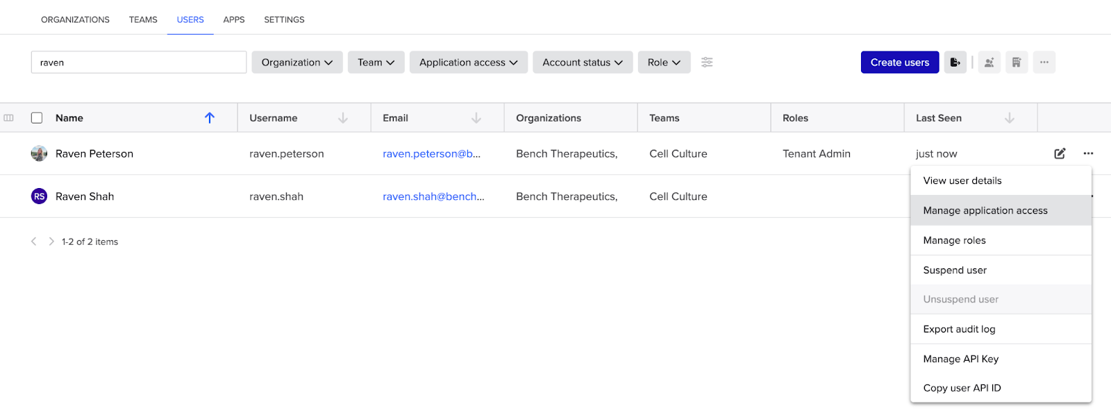 3. Find the user that needs access and click icon at the right of the list of users and click Manage application access